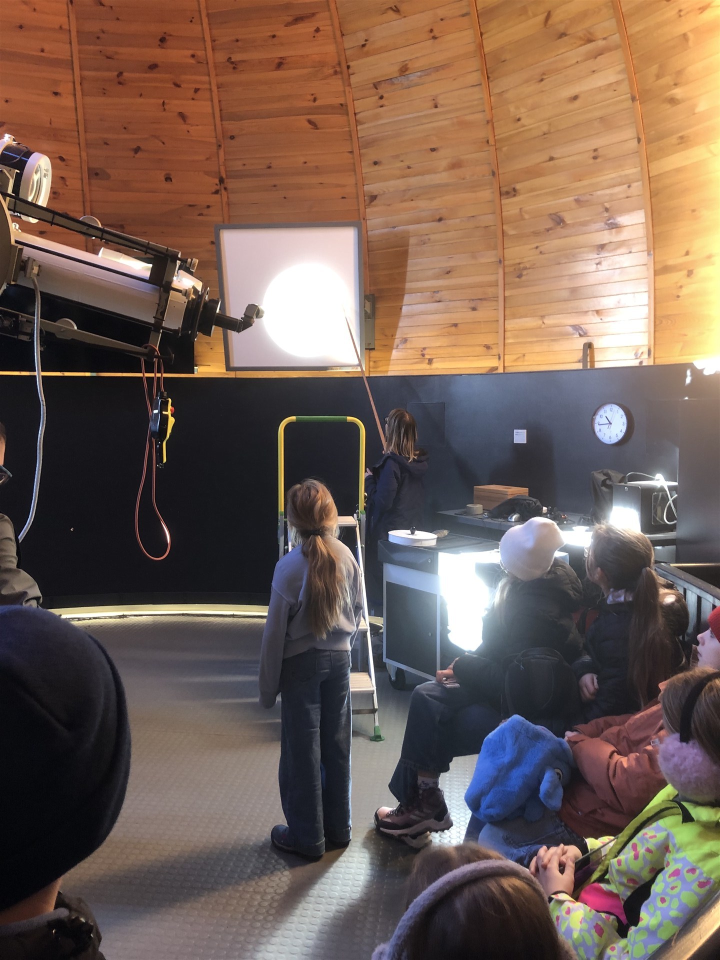 A jako třešničku na dortu, jsme měli možnost bezpečně pozorovat v kupoli Slunce projekční metodou, kdy se obraz Slunce promítá z dalekohledu na stíněnou plochu.