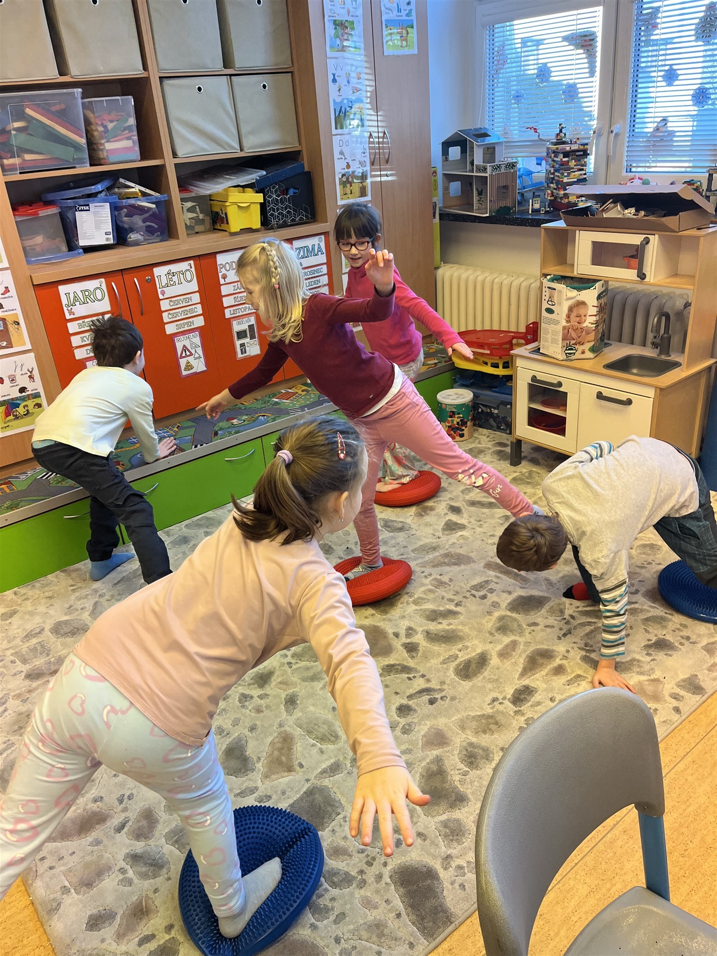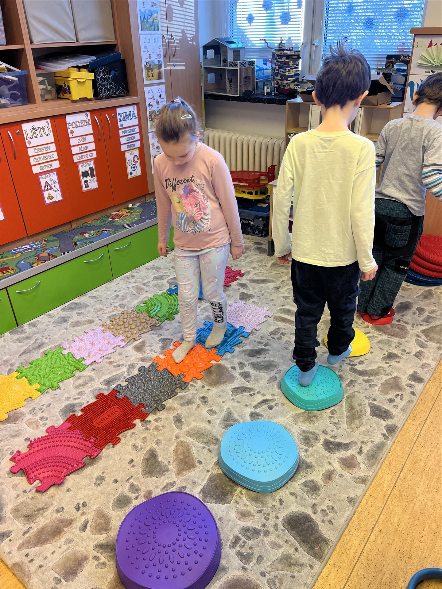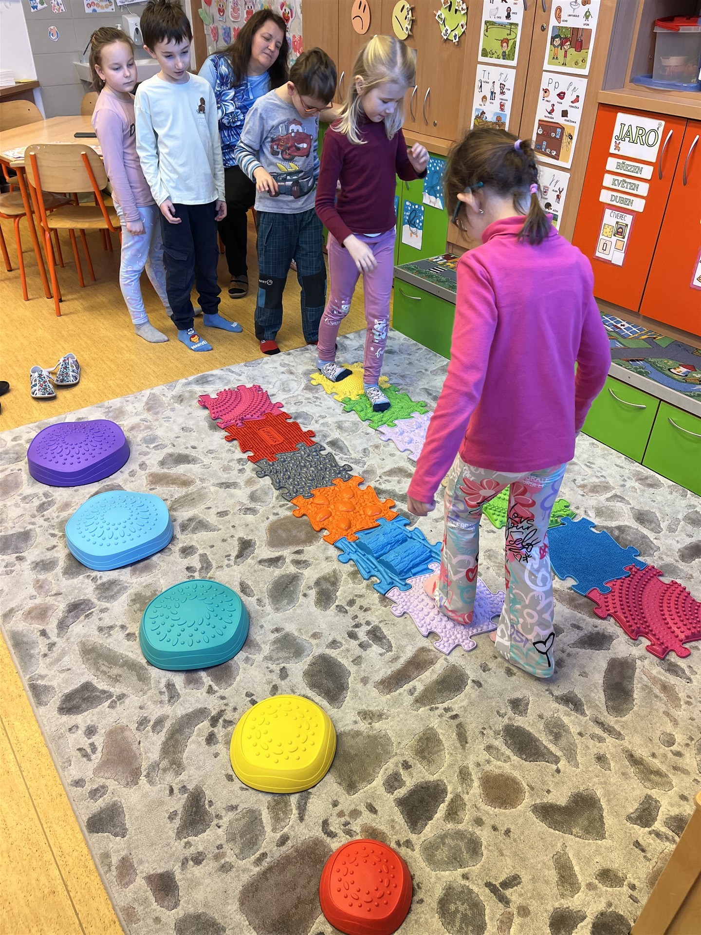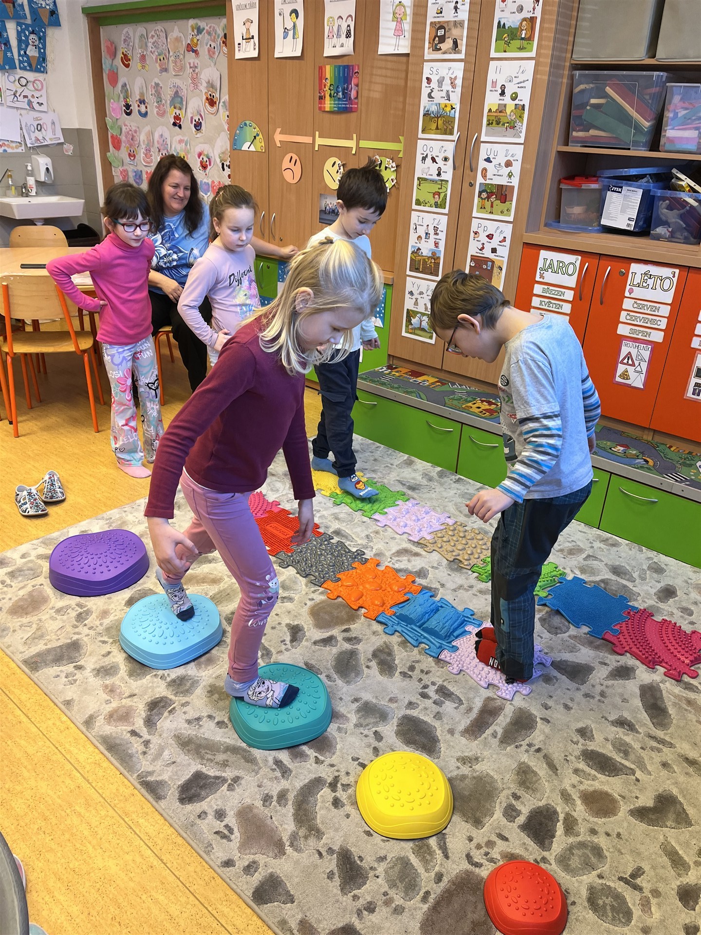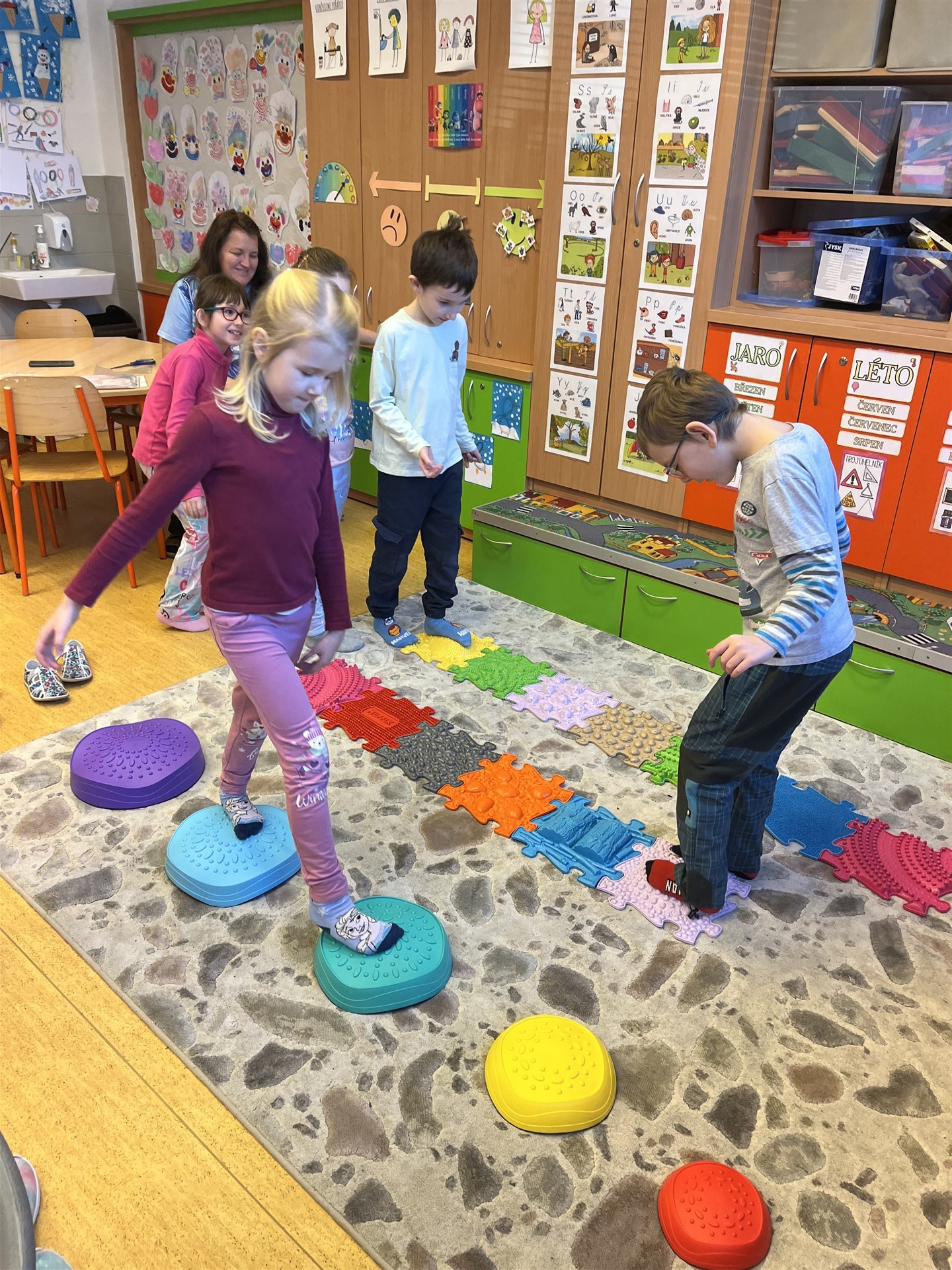 Ve středu jsme měli tělocvik trošku jinak. Promasírovali jsme si nohy masážními balónky, prošli cestičku z Mufíků, přeskákali balanční kameny a vyzkoušeli rovnovážná cvičení.