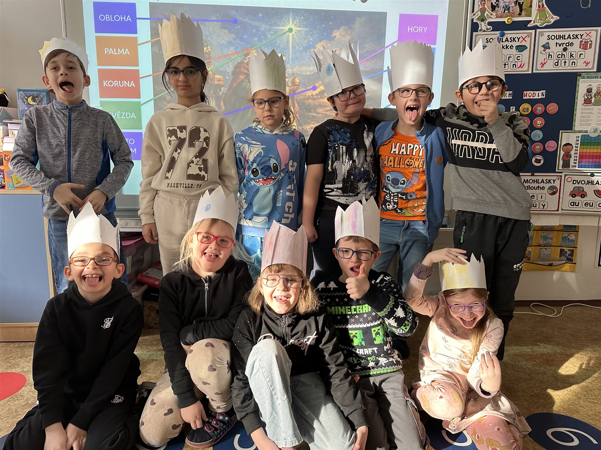 Dnešní vyučování jsme s dětmi věnovali projektu Tři králové. Hned na začátku hodiny si všichni s nadšením vyrobili vlastní královské korunky, které nám vytvořily tu pravou sváteční atmosféru. Společně jsme se naučili a zazpívali tradiční koledu „My tři králové“.