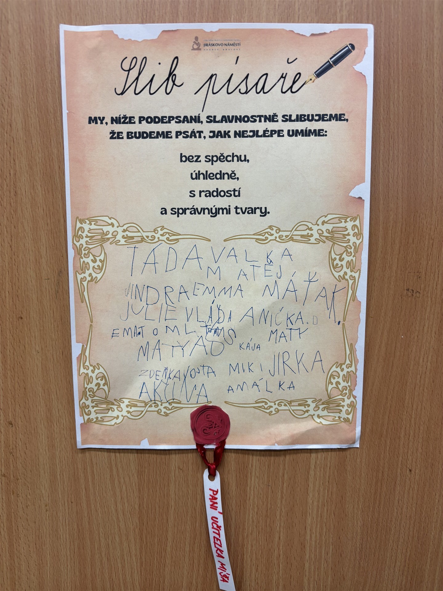 Našimi úplně prvními tahy perem poté byly naše podpisy na listině Slib písaře, která nám pro připomínku tohoto slavnostního dne visí ve třídě.