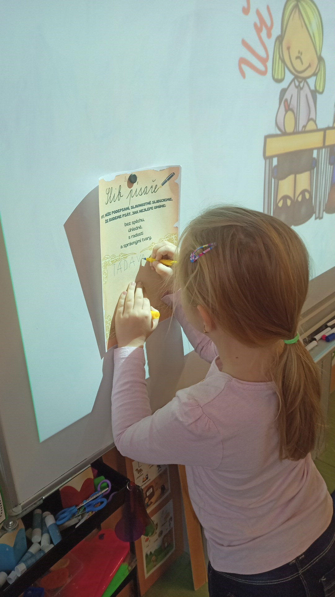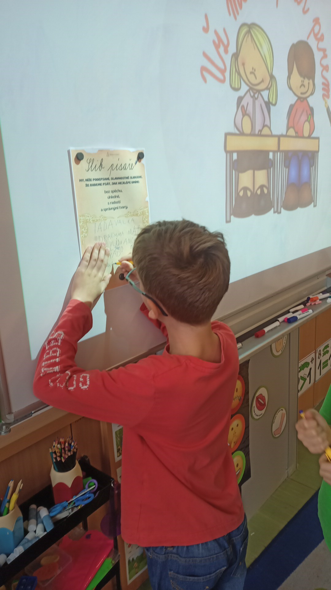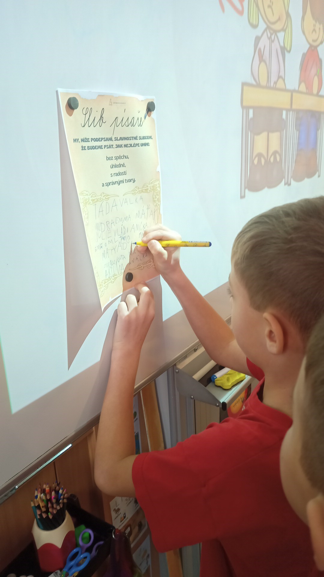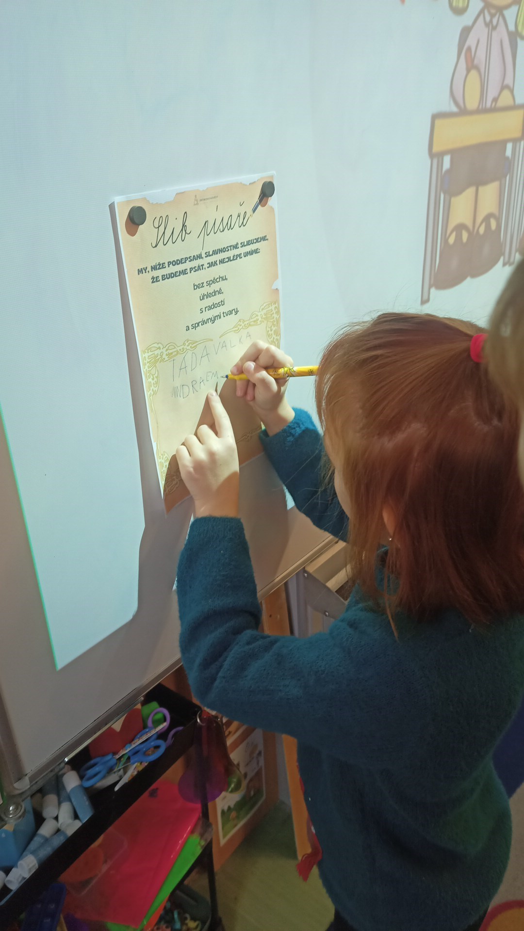 Našimi úplně prvními tahy perem poté byly naše podpisy na listině Slib písaře, která nám pro připomínku tohoto slavnostního dne visí ve třídě.