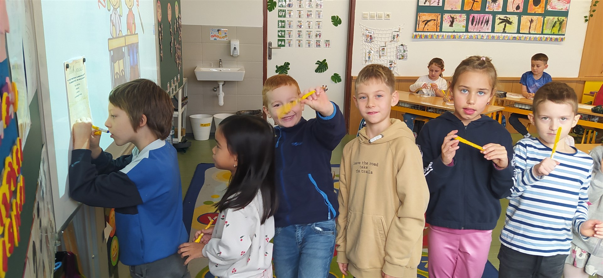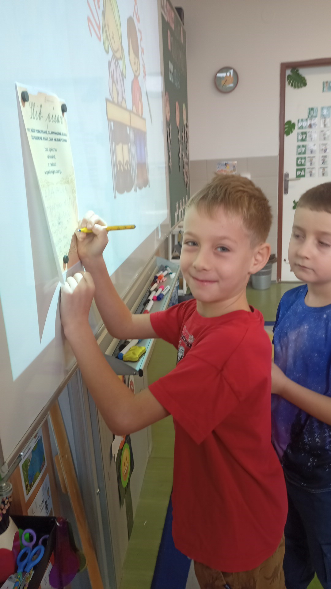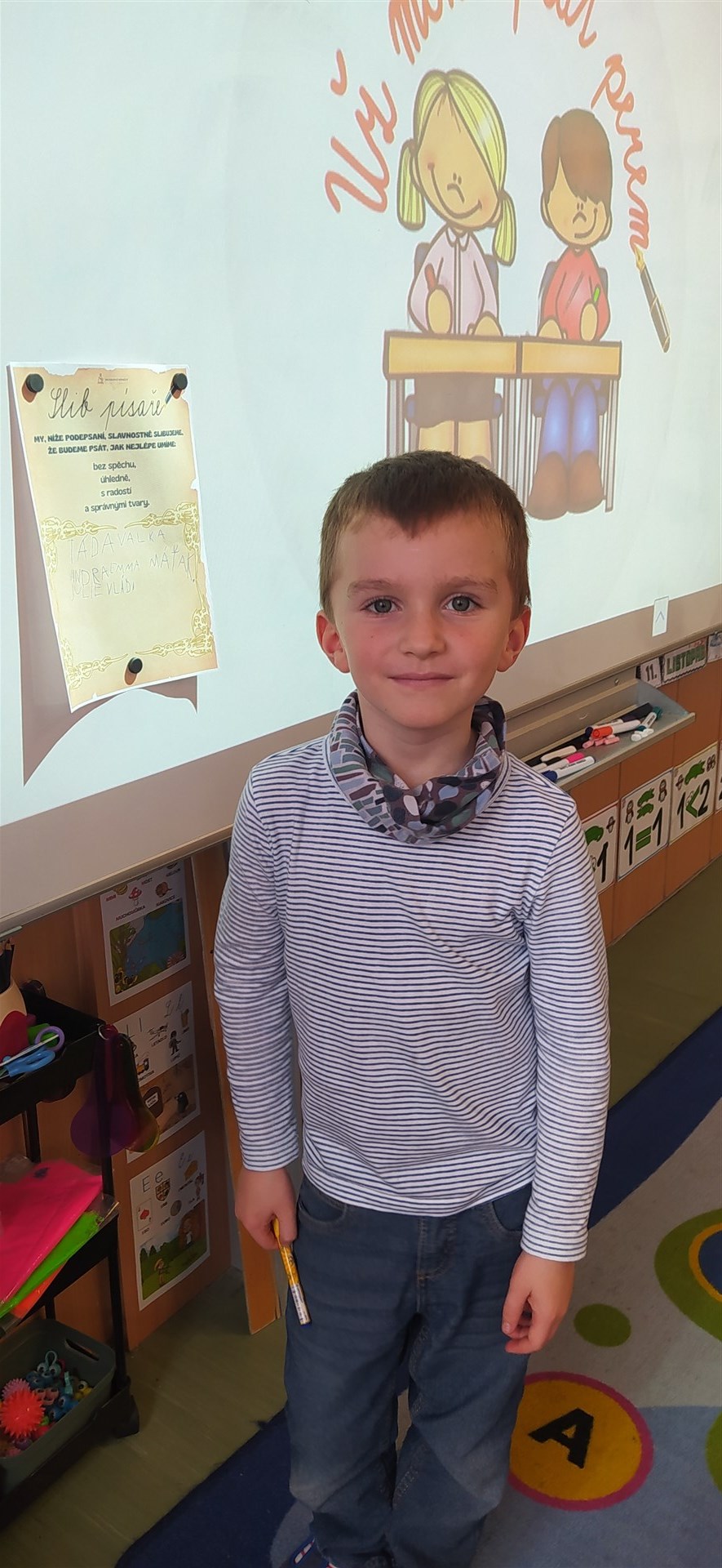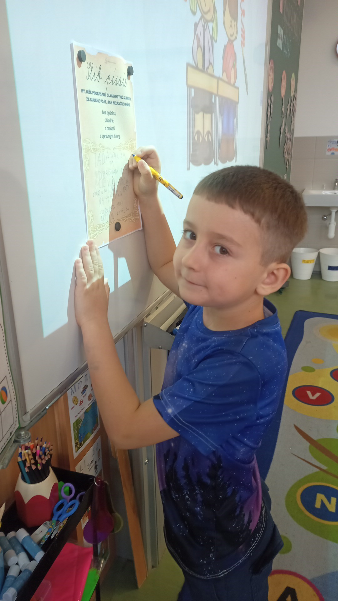 Našimi úplně prvními tahy perem poté byly naše podpisy na listině Slib písaře, která nám pro připomínku tohoto slavnostního dne visí ve třídě.