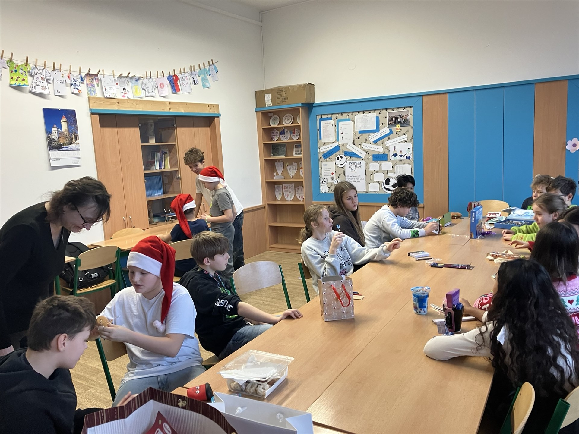 V pátek 19. prosince jsme se už vsichni těšili na prázdniny. Přesto nakonec kluci zůstali ve škole ještě o dvě hodiny déle, než by museli a udělali jsme si třídní vánoční besídku. Během ní jsme si předali dárky, od pana učitele jsme dostali propisky se svými jmény a na závěr si všichni společně zahráli Kahoot na téma Vánoce.